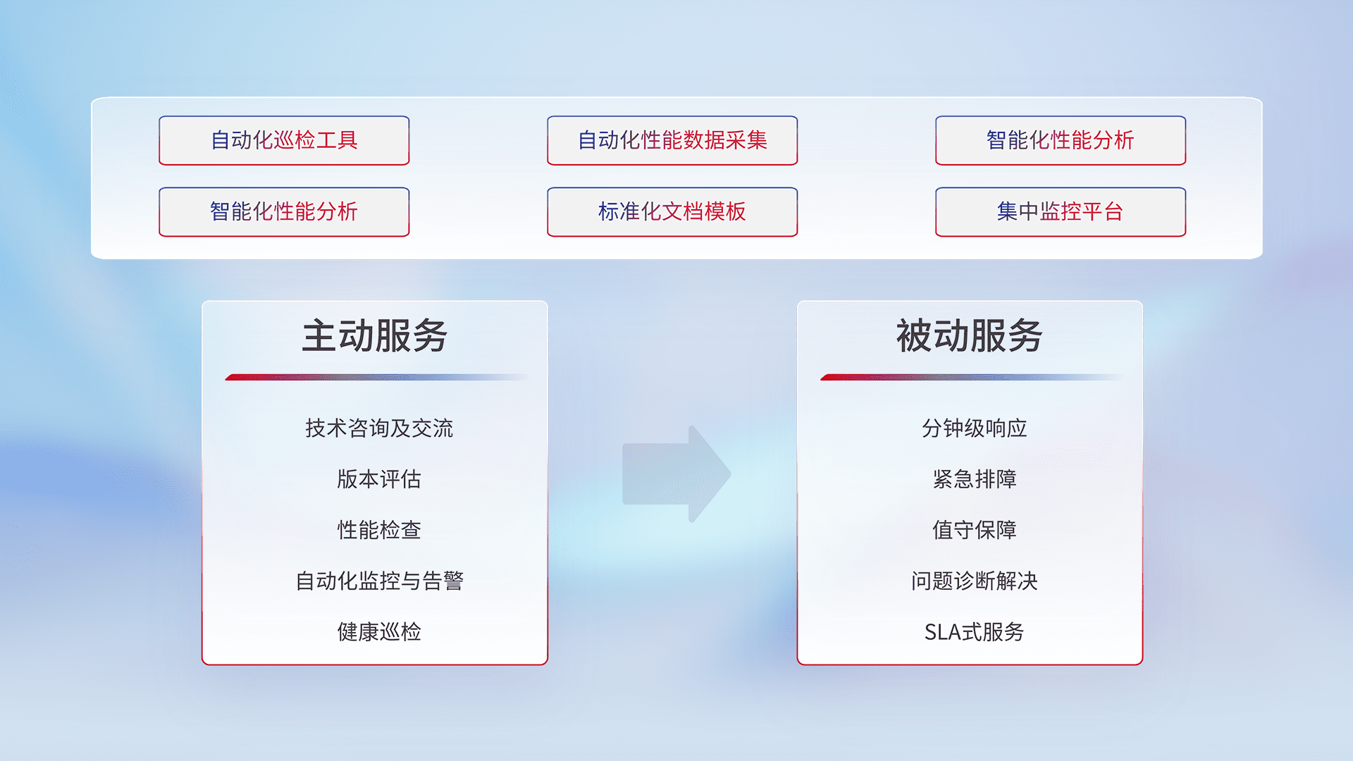 智能化工具和标准化文档,,,保障服务质量,,提供主动服务(包含技术咨询、、、、版本评估、、性能检查、、自动化监控与告警、、、、健康巡检)和被动服务包含(分钟级响应、、紧急排障、、、值守保障、、、、问题诊断解决、、、、SLA服务)。。